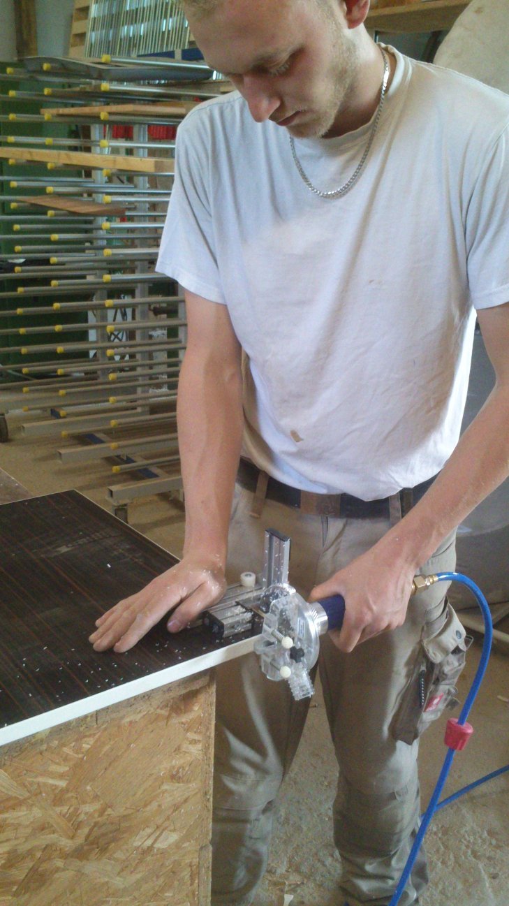 As a young company, not everyone has the necessary start-up capital. To save costs, a lavish second-hand edge banding machine was purchased. However, this does not have an integrated corner copier. Many attempts to mill or file cabinet doors, double drawers etc. precisely cost a lot of time and labour. In order to be able to deliver competitive quality, we searched the internet and found the ideal solution to our problem.